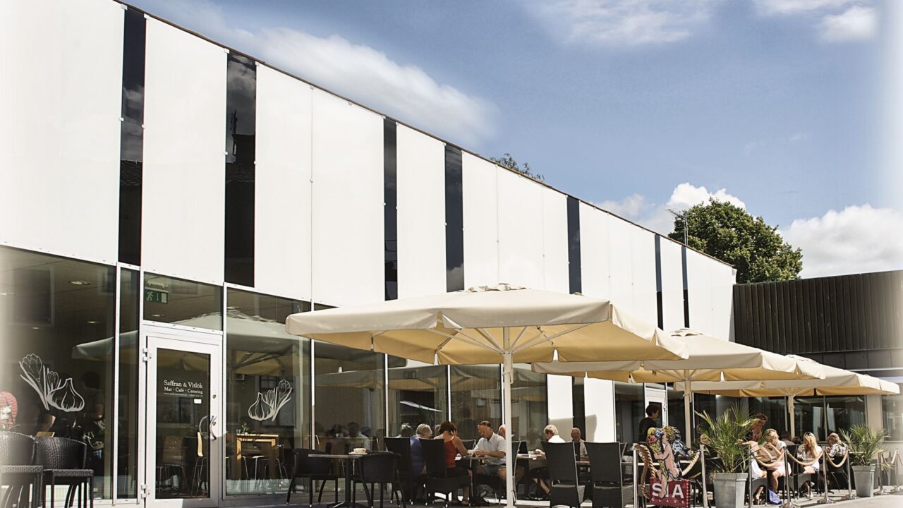 Saffran & Vitlök ligger mitt i Sunne centrum i det randiga bibliotekshuset